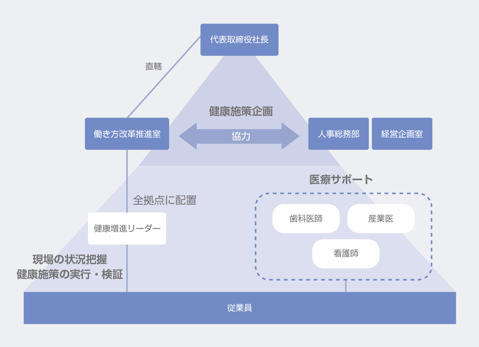 当社の「健康経営」の推進体制は、経営トップ直轄の部署である「働き方改革推進室」が担当しています。そこで決定された施策を実行するため、各現場には、「健康増進リーダー」を任命しています。