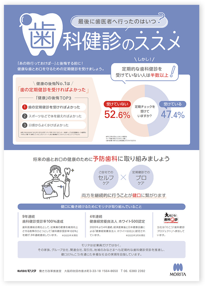 歯科医療総合商社として、お口の健康は全身の健康と深いかかわりがあることを認識し、従業員の健康を維持向上させる施策のひとつとして、「歯科健診受診率100%」を掲げ、10年連続達成しています。