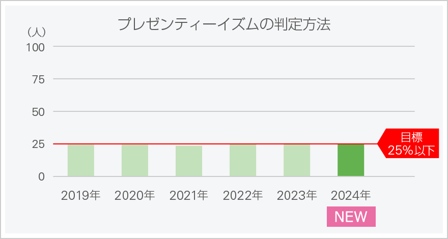 当社のプレゼンティーズムは、4択形式の回答から算出しているため、目標を、4分の1である25%以下としています。