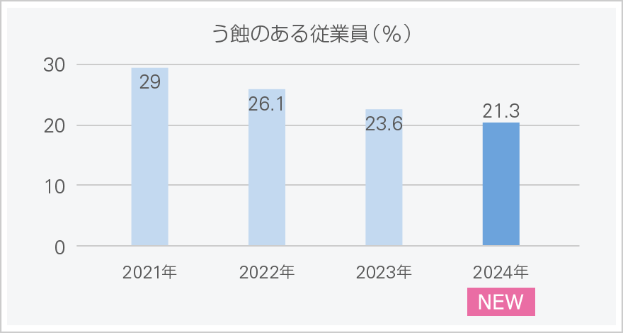 従業員のう蝕のある人は、減少傾向にあります。全体で21.3%と日本平均31.6%(令和4年歯科疾患実態調査)より良い状況です。